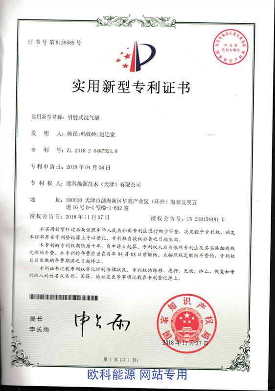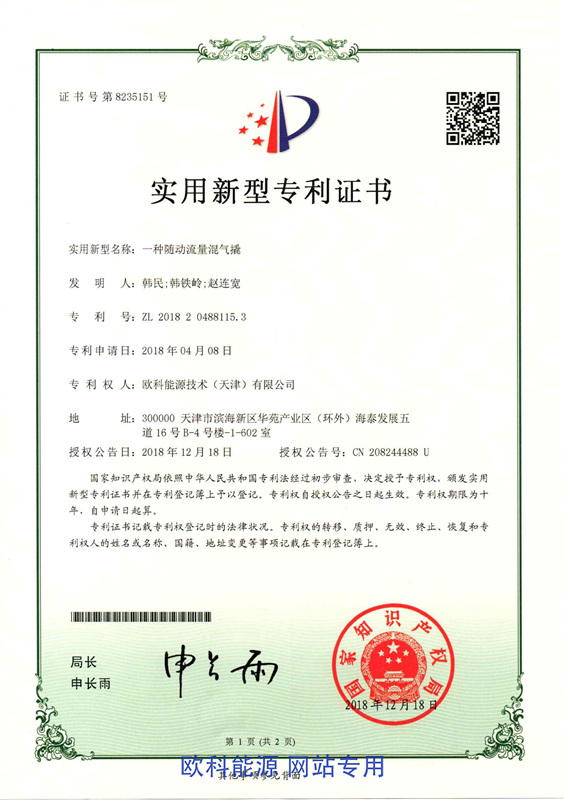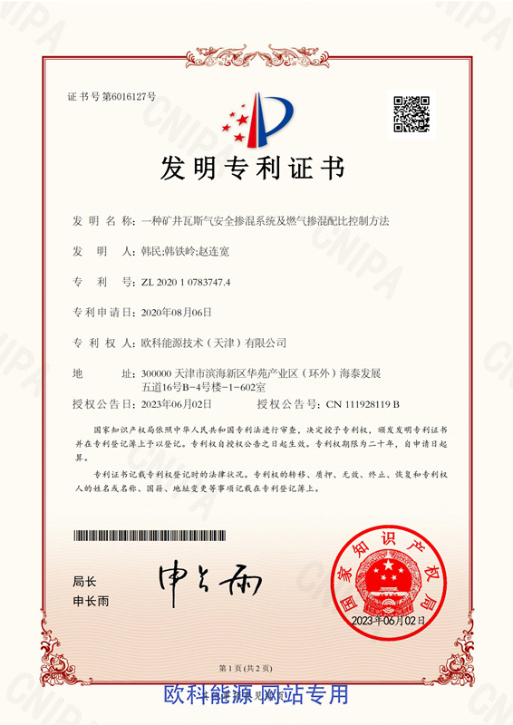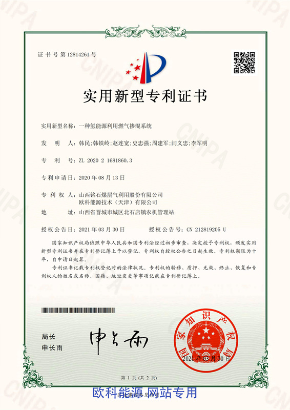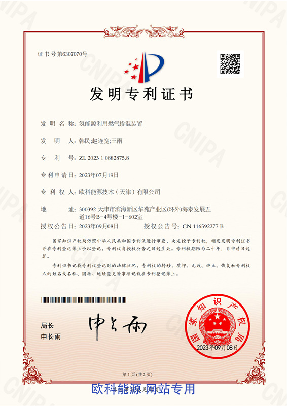氢能源利用燃气掺混系统专利证书
