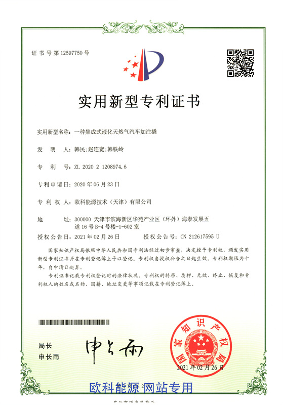 实用新型专利证书(一种集成式液化天然气汽车加注撬)