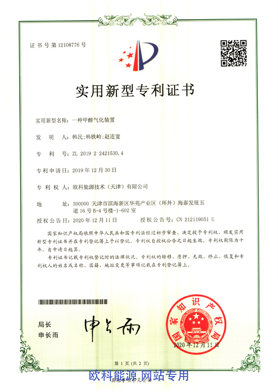 实用新型专利证书(一种甲醇气化装置)