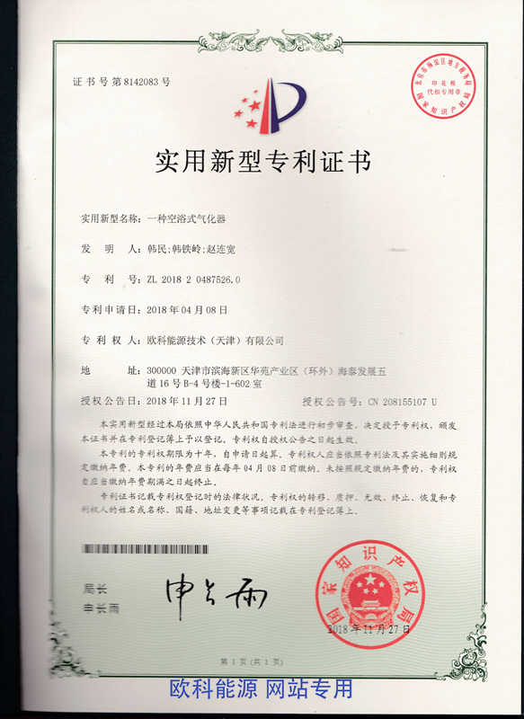 实用新型专利证书(一种空浴式气化器)