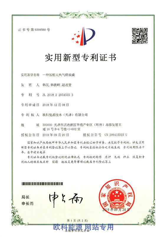 实用新型专利证书(一种压缩天然气释放撬)