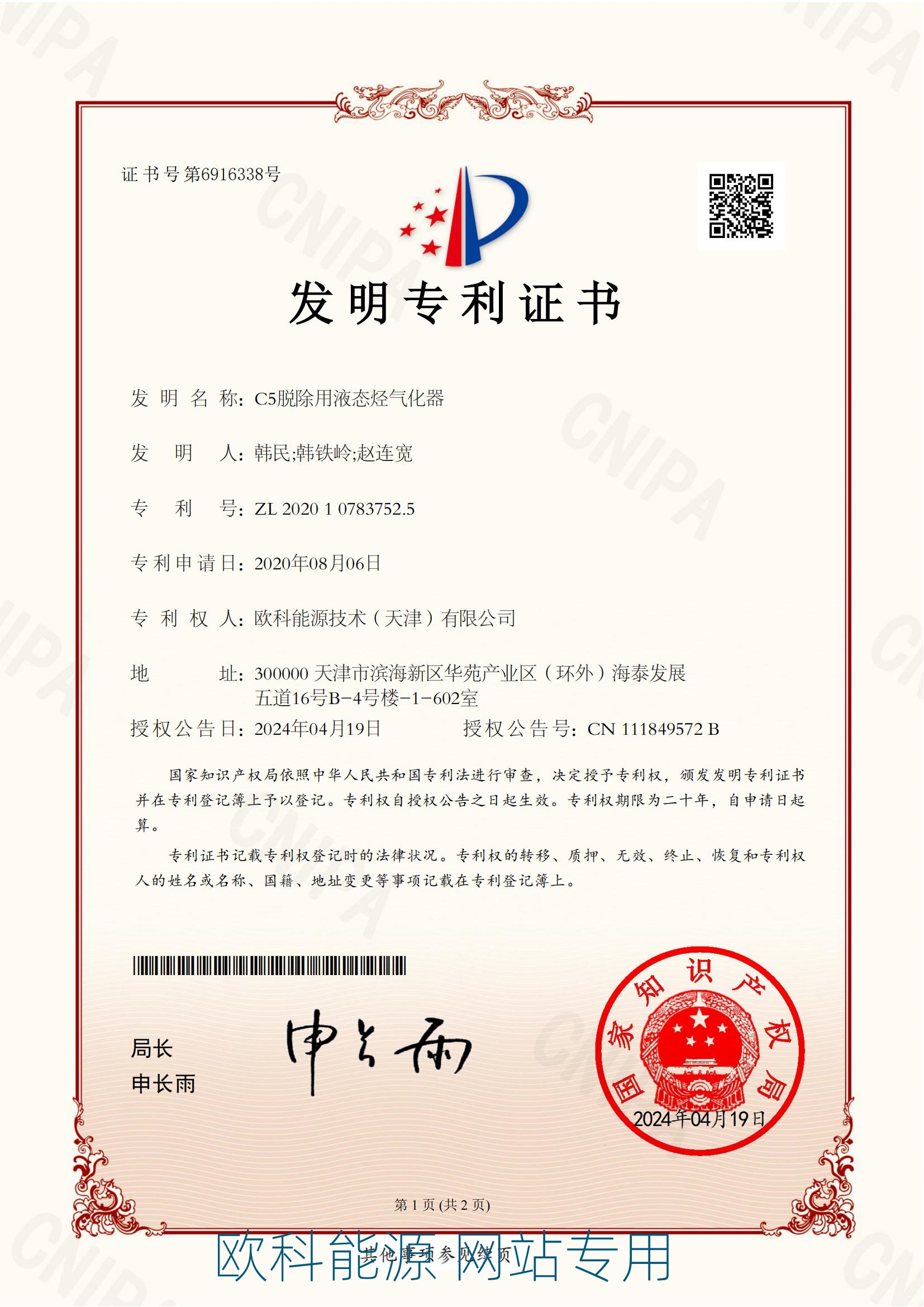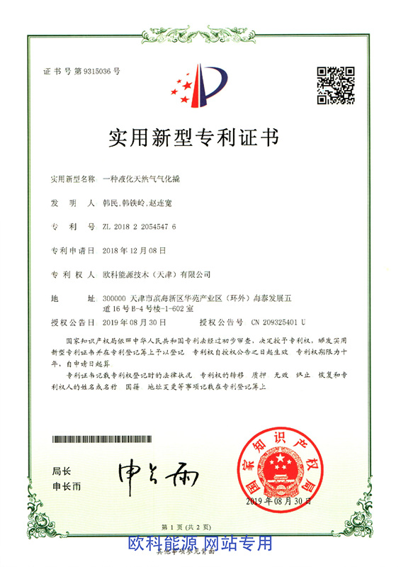 实用新型专利证书(一种液化天然气气化撬)