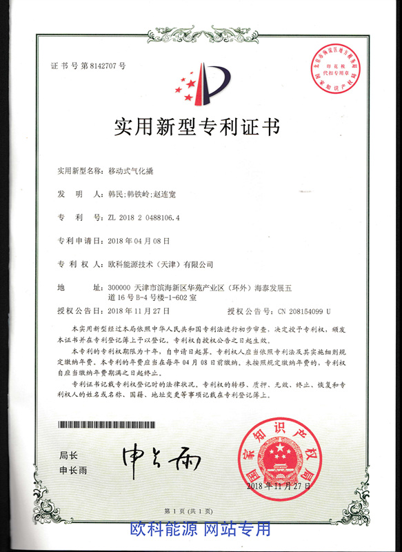 实用新型专利证书(移动式气化撬)
