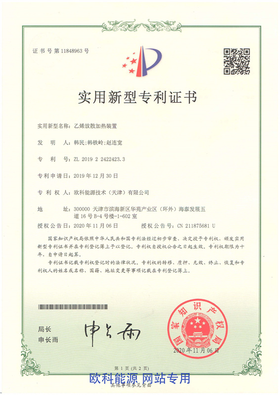实用新型专利证书(乙烯放散加热装置)