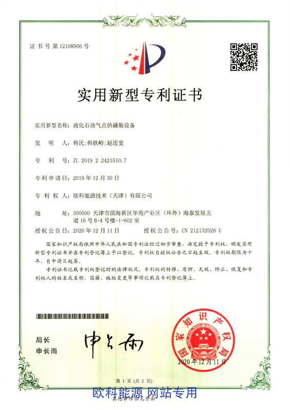 实用新型专利证书(液化石油气点供撬装设备)